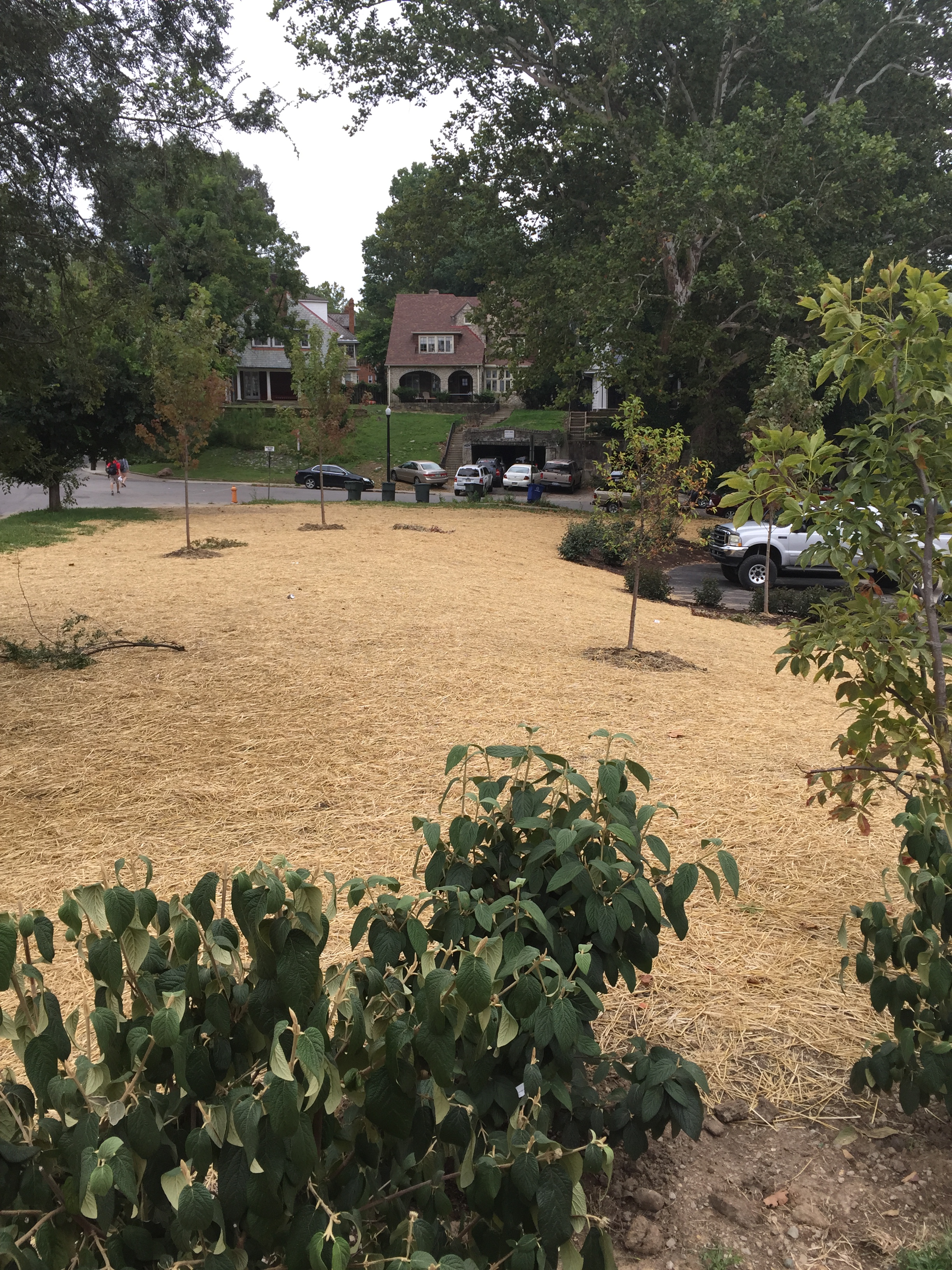 Once in a while we have to get lucky. June had 24 days with rain in Columbus, not good for our project. We had about a half inch of rain last night, just right to get the grass seed wet and wet down the straw cover. Perfect!